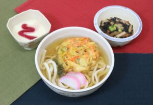 ごはん かき揚げうどん ひじきの煮物 豆乳プリン