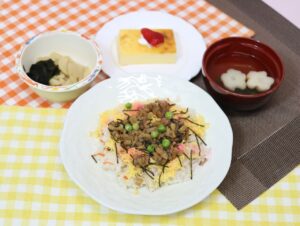 2026.03.03 ひな祭り特別献立 【本日昼食の特別献立】 穴子ちらし寿司 若竹煮 すまし汁 チーズケーキ 【穴子ちらし寿司 レシピ】 材料(1人分) 米75g すし酢5g ちらし寿司の素20g 白いりごま1g 卵1/2個 あなご20g 蒲焼きのたれ3g みりん1g グリンピース3g 桜でんぶ適量 刻みのり適量