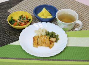 ごはん タンドリーチキン ポパイサラダ コンソメスープ パイナップル