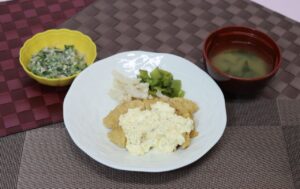 ごはん チキン南蛮 おくらの胡麻和え みそ汁