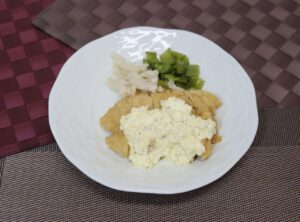 タルタルソース:鶏卵20g 玉ねぎ20g 穀物酢1g 砂糖2g レモン汁1g ドライパセリ0.1g マヨネーズ8g