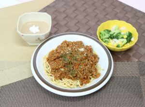 ごはん ボロネーゼ 花野菜サラダ ミルクティープリン