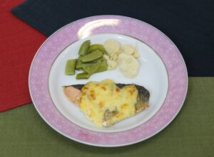 材料(1人分) マス1切れ 塩0.2g 胡椒0.01g サラダ油1g コーン8g マヨネーズ10g