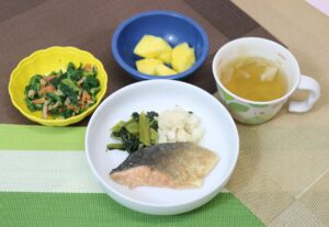 ごはん マスのムニエル ポパイサラダ コンソメスープ パイナップル
