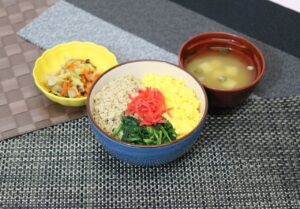 三色丼 白菜の塩昆布和え みそ汁