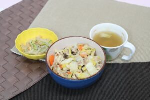 材料(1人分) 米75g 豚肉40g むきえび20g 白菜40g たけのこ水煮20g 人参15g きくらげ1g