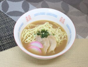 ③中華麺は茹で器に盛り付け①のスープを入れ、焼き豚、蒲鉾、青葱をトッピングします。