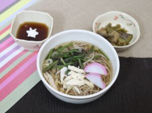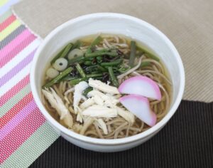 ④器にそばを入れ、②のつゆを注ぎ、山菜、蒸し鶏、かまぼこをトッピングします。