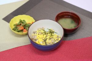 焼き鳥丼 いんげんのピーナッツ和え みそ汁