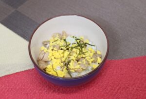 ⑥器にごはんを盛り、⑤のそぼろ卵、④の鶏肉をのせ、長ネギ、刻みのりをかけます。