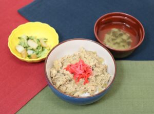 牛丼 ブロッコリーのごま和え すまし汁