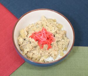 ⑤器にごはんを入れ、④をかけ、紅生姜を盛り付けます。