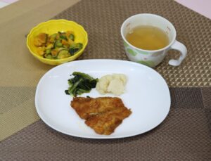 ごはん 白身魚のカレーソテー かぼちゃのマスタードサラダ コンソメスープ