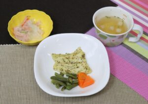 ごはん 白身魚のバジルソテー オニオンサラダ コンソメスープ