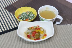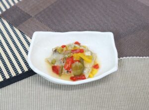 たまねぎ15g 三色ピーマン30g レモン果汁3g 穀物酢3g 砂糖3g 塩0.1g