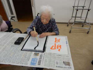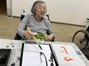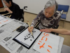 書道クラブで真剣なご様子の皆様。美しい文字は日々の積み重ね、1日にしてならずと言いますので、長年培ってきた習慣が垣間見える書道というものの素晴らしさに感服するばかりです。