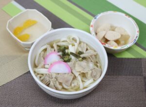 ごはん 肉うどん いかつみれの煮物 みかんゼリー