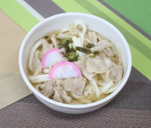 ⑤器にうどんを入れ、つゆを注ぎ、豚肉、たまねぎ、かまぼこ、青ねぎを盛り付けます。