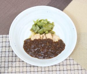 ⑤器に①の蒸し鶏をのせ、④の麻婆あんをかけます。