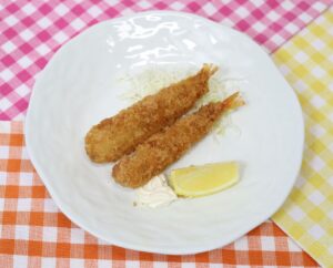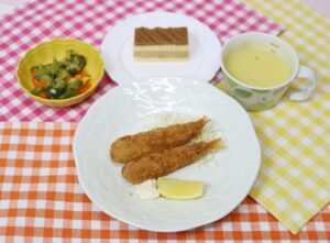 2025.09.24 誕生会特別献立 【本日昼食の特別献立】 ごはん エビフライ ナッツサラダ コーンスープ マロンケーキ 【エビフライ レシピ】 材料(1人分) エビ2尾 塩こしょう適量 小麦粉3g 生パン粉8g 卵5g 油8g