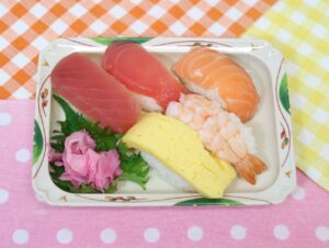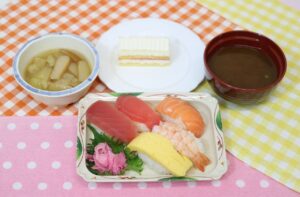 2026.02.25 誕生会特別献立 【本日昼食の献立】 にぎり寿司 じゃが芋のだし煮 赤だし ショートケーキ 【にぎり寿司 レシピ】 1人分・・・米70g 塩適量 砂糖4g 酢10g えび1尾 サーモン12g まぐろ24g 卵1/2個 大葉1枚 甘酢生姜10g 濃口醤油10g 粉わさび適量