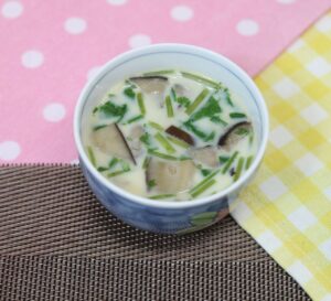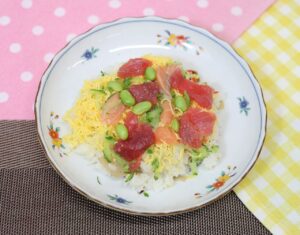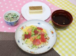 2026.03.25 誕生会特別献立 【本日昼食の献立】 ばらちらし 茶碗蒸し 赤だし マロンケーキ 【ばらちらし レシピ】 材料(1人分) 精白米75g すし酢5g ちらし寿司の素20g 白いりごま1g マグロ20g サーモン10g 卵1/2個 きゅうり15g むき枝豆4g うすくち醤油3g
