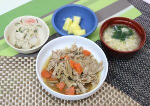ごはん 豚肉のしぐれ煮 里芋のそぼろ炒め かきたま汁 パイナップル