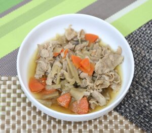 材料(1人分) 豚肉80g たまねぎ30g ごぼう30g にんじん20g