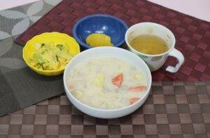 ごはん 豚肉のクリーム煮 ミモザサラダ コソメンスープ オレンジ