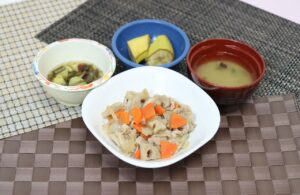 ごはん 豚肉の醤油麹炒め さつまいもの切り昆布煮 みそ汁 バナナ