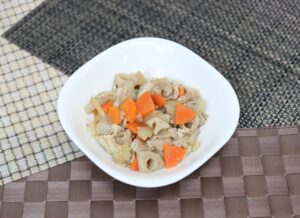 材料(1人分) 豚肉80g 玉ねぎ40g れんこん20g 人参20g