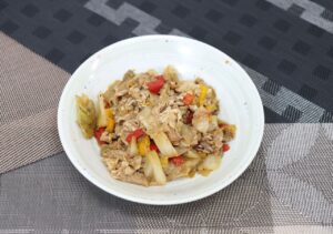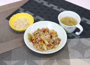 材料(1人分) 豚肉60g キャベツ40g ピーマン(黄)15g ピーマン(赤)10g