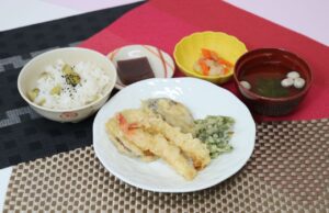 栗ごはん 天ぷらの盛り合わせ かぶの菊花和え すまし汁 水ようかん