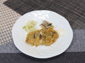 材料(1人分) 鯵1切 食塩0.1g こしょう適量 フリットミックス10g ドライパセリ0.2g サラダ油7g タルタルソース6g