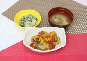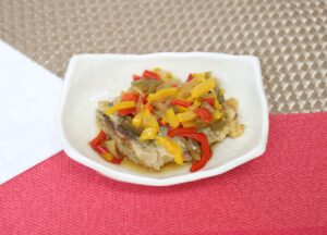 緑ピーマン10g 赤ピーマン10g 黄ピーマン10g 玉ねぎ20g 上白糖2g うすくち醤油4g 穀物酢6g だし汁20g