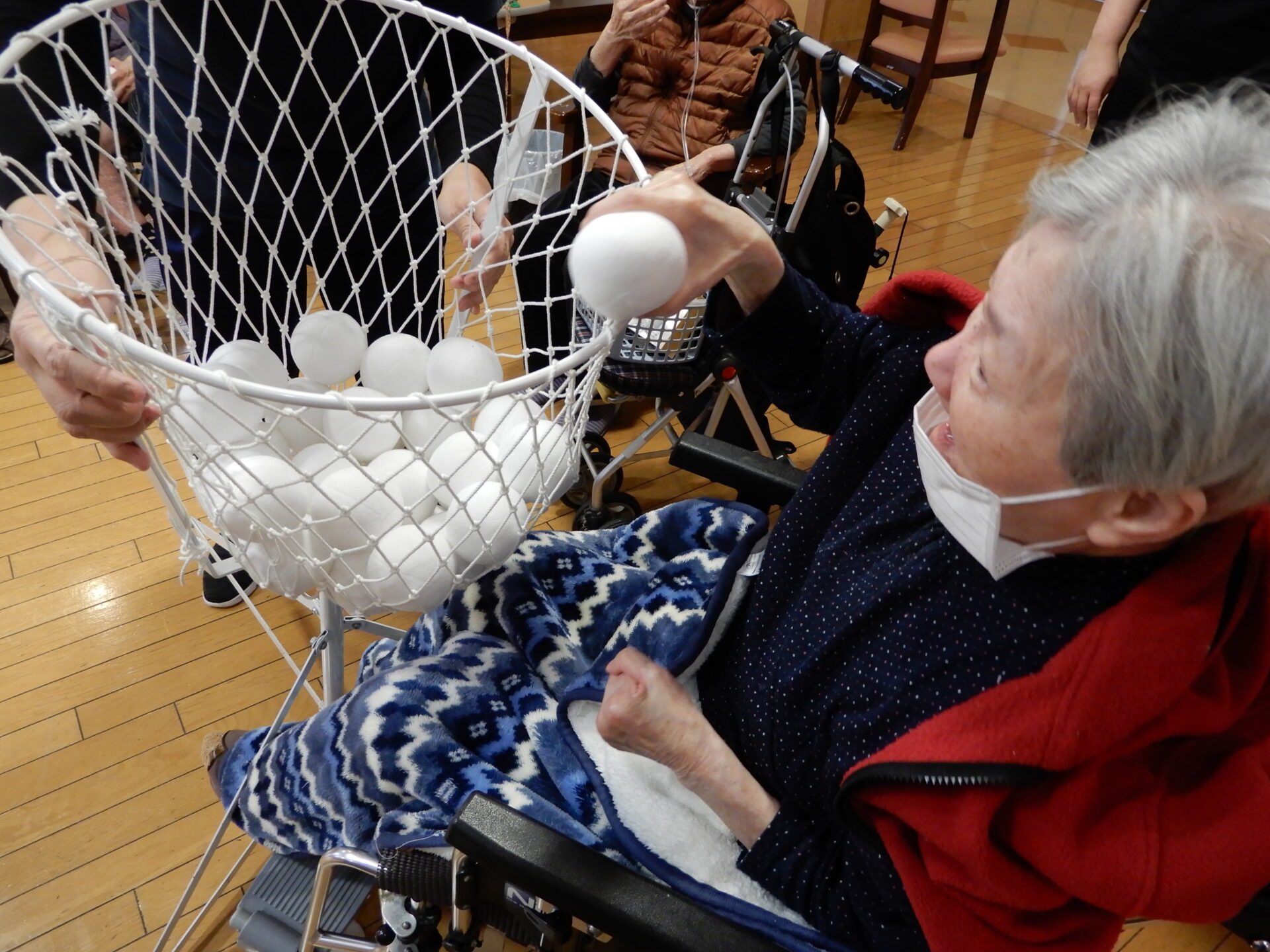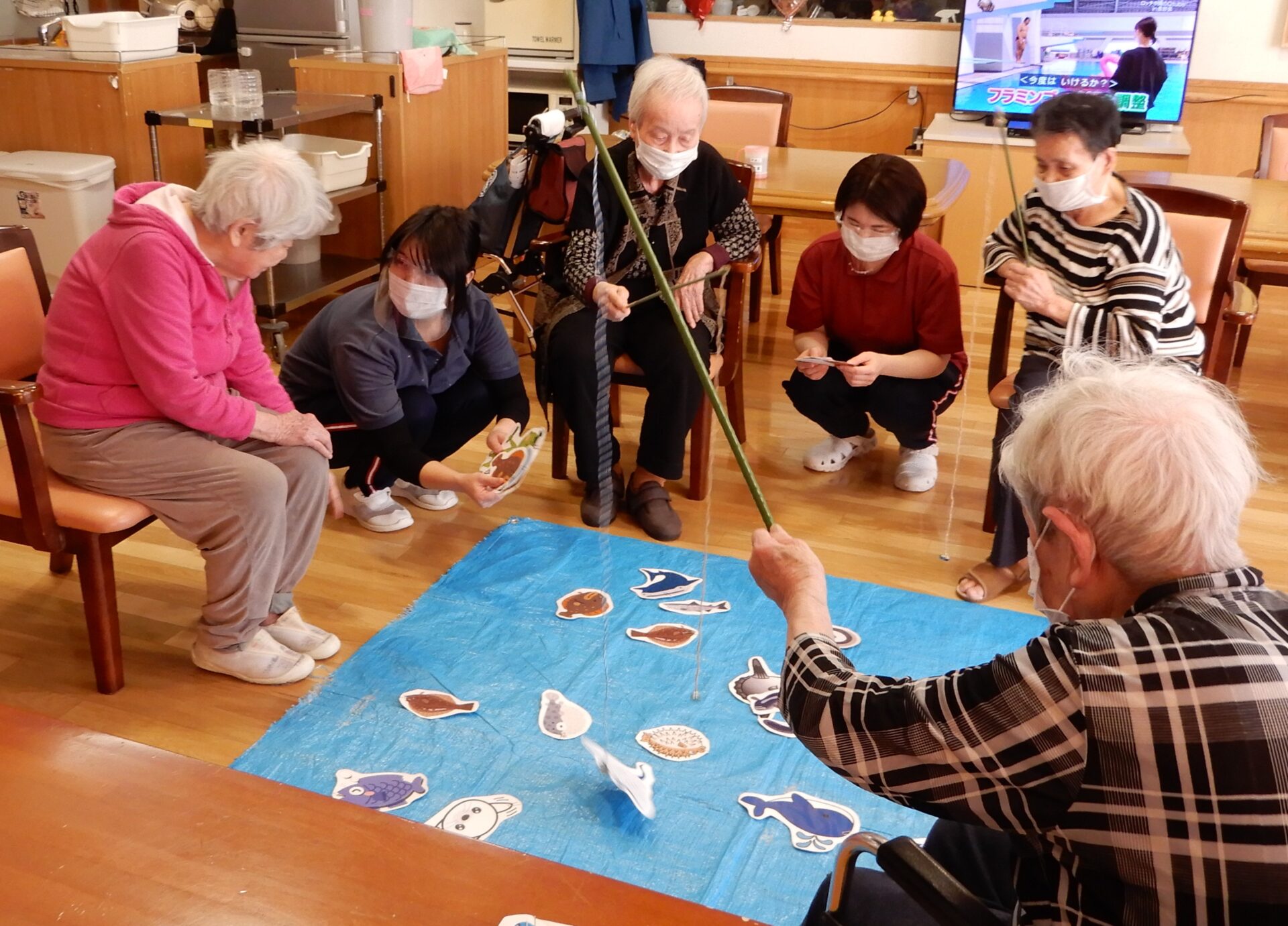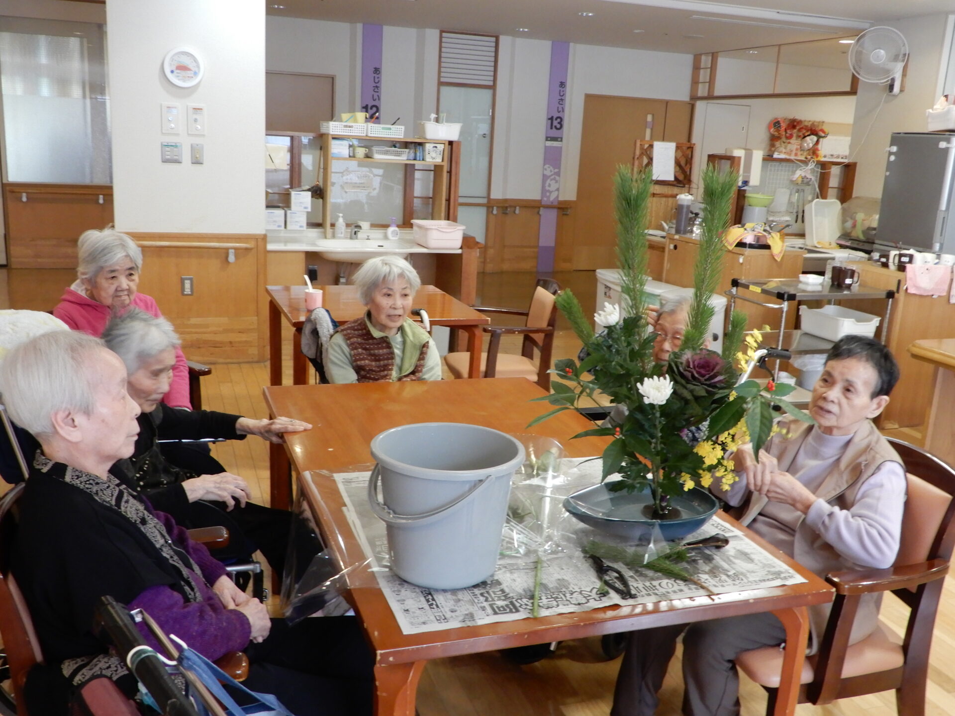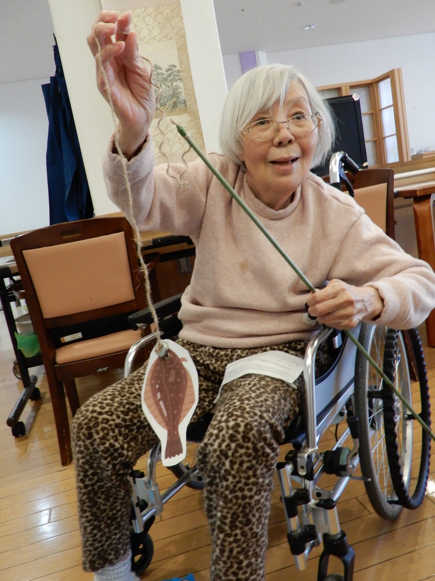 今月は、多くのレクリエーションがあり、生け花や魚釣り、玉入れや餅つきに、