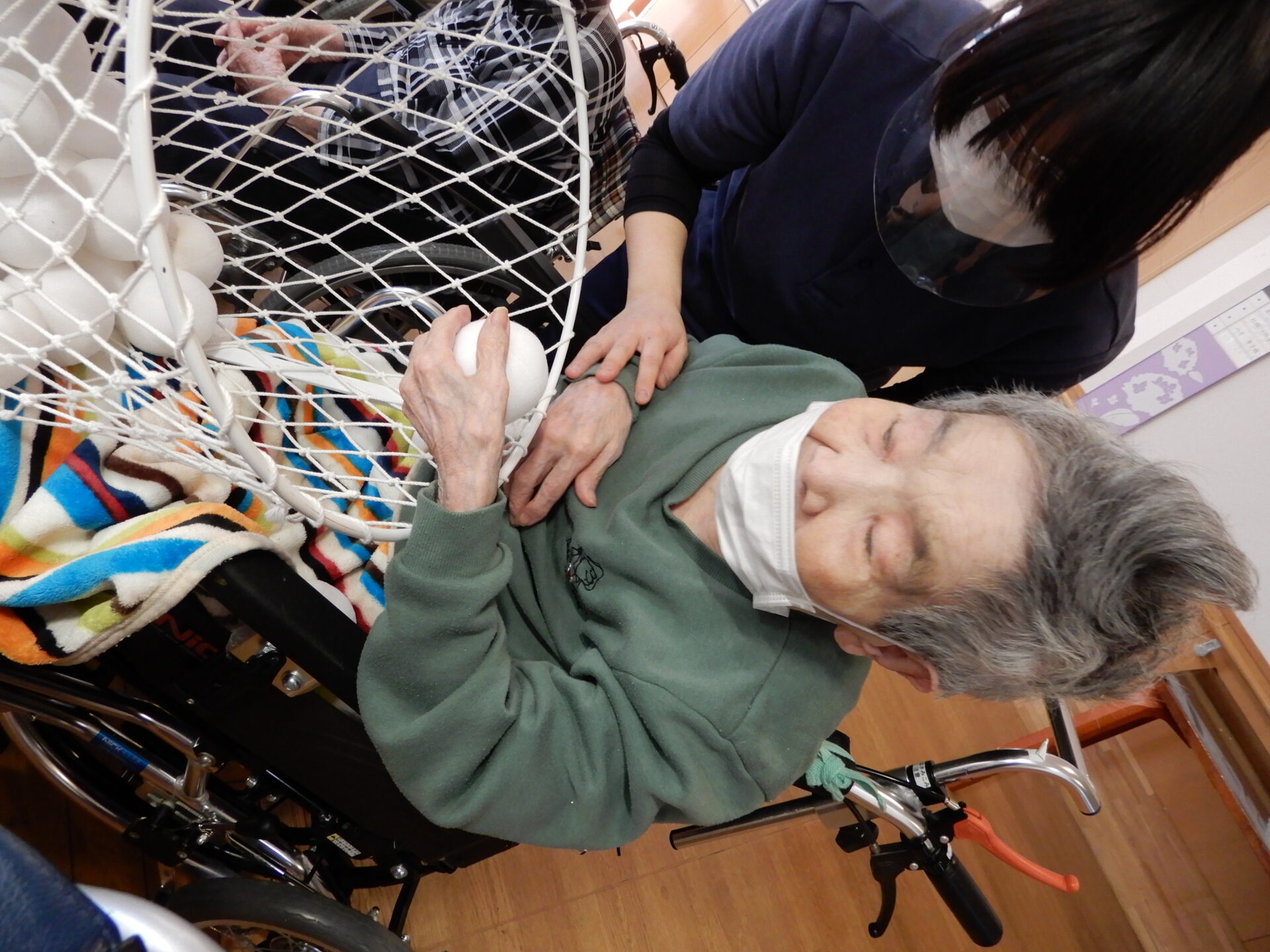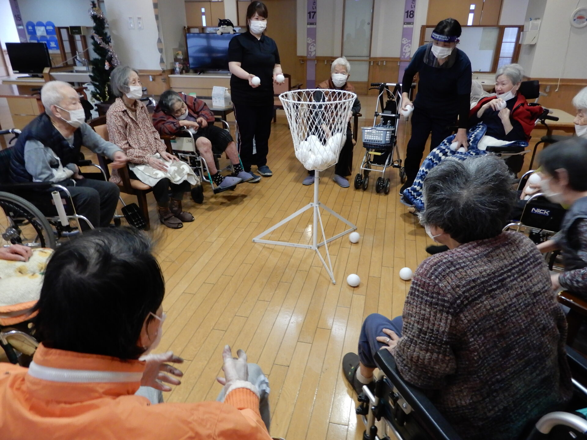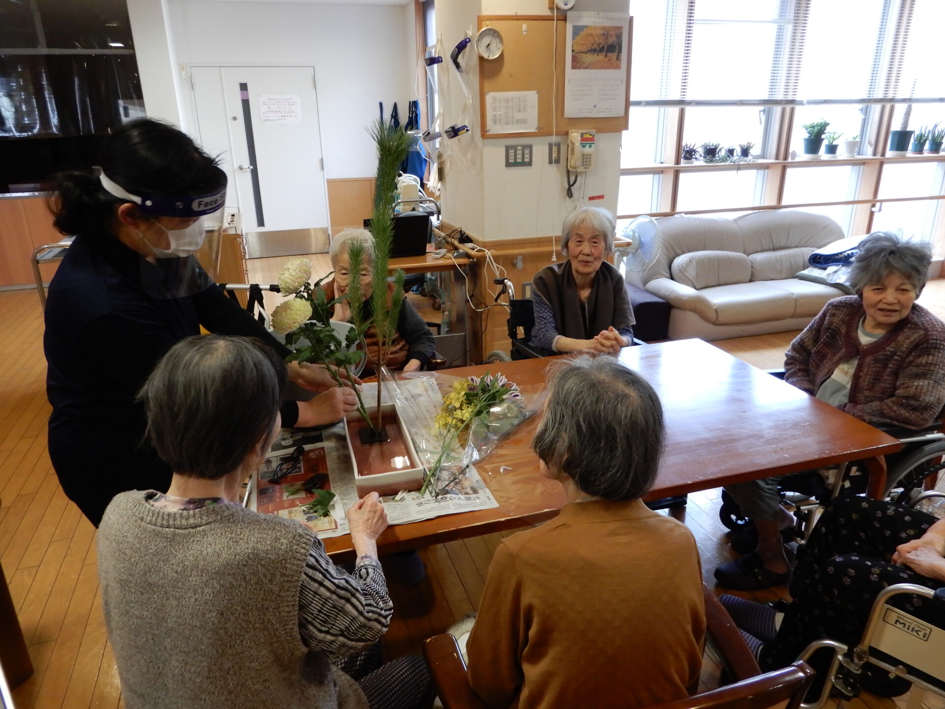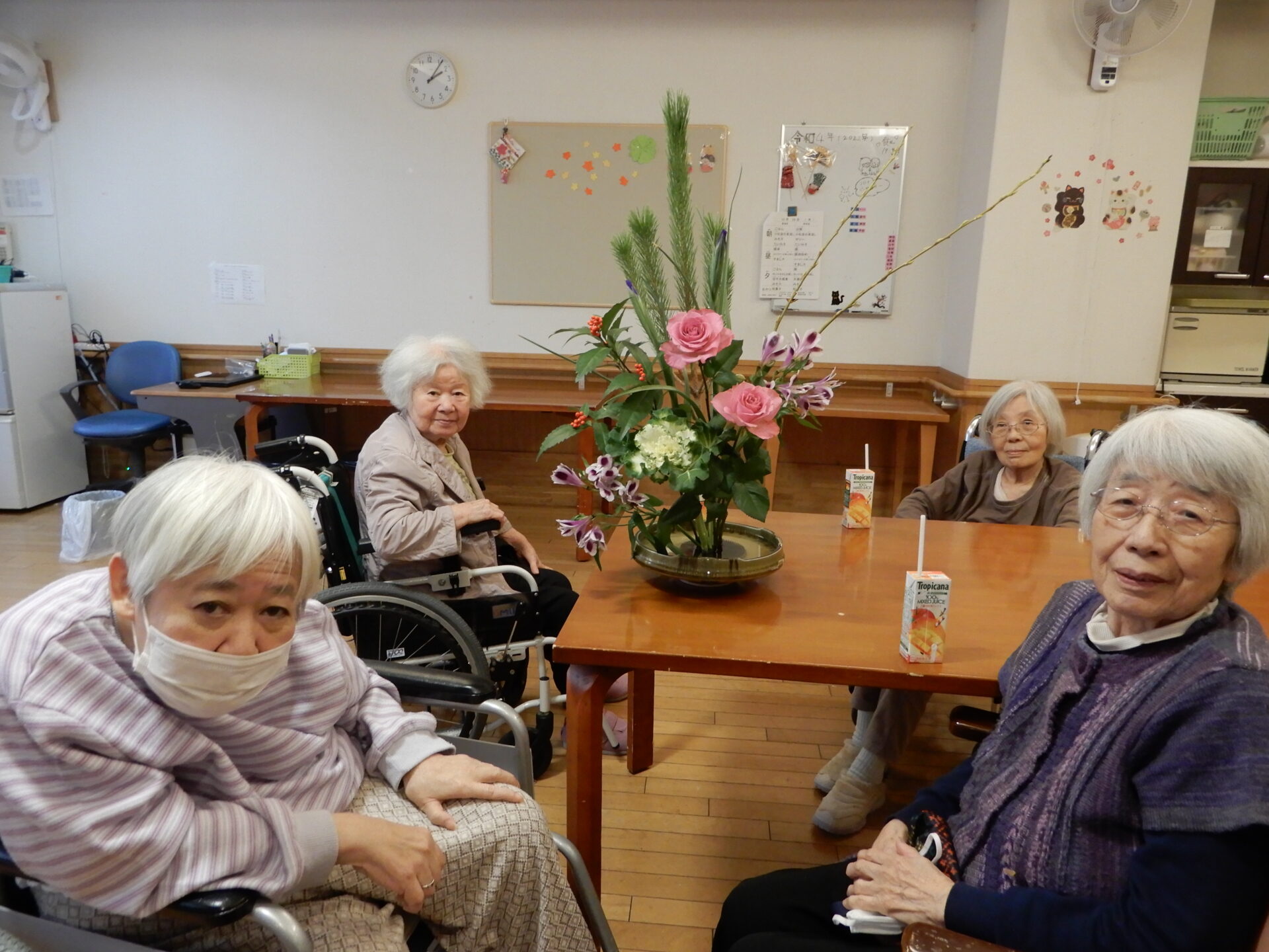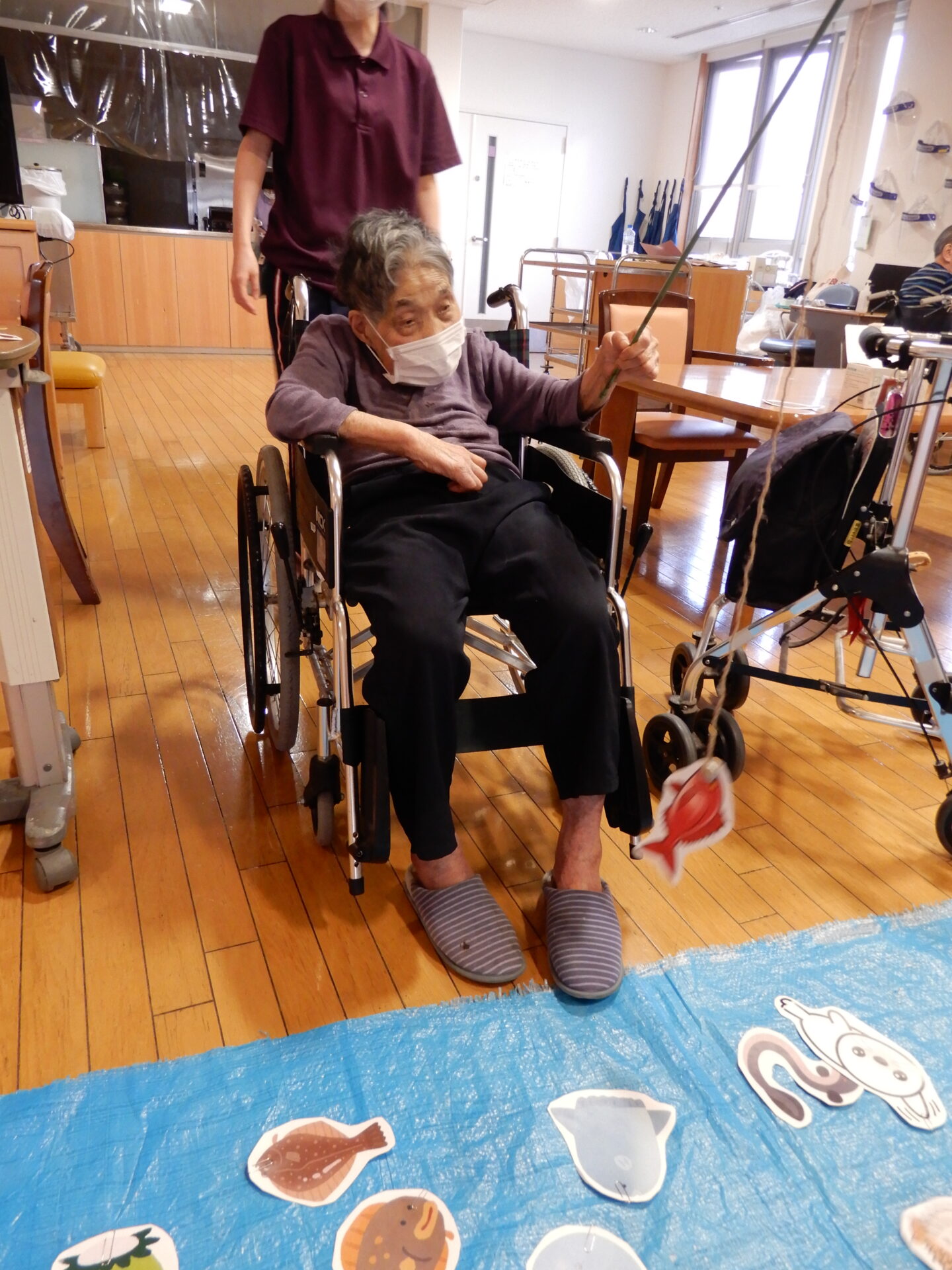今月は、多くのレクリエーションがあり、生け花や魚釣り、玉入れや餅つきに、