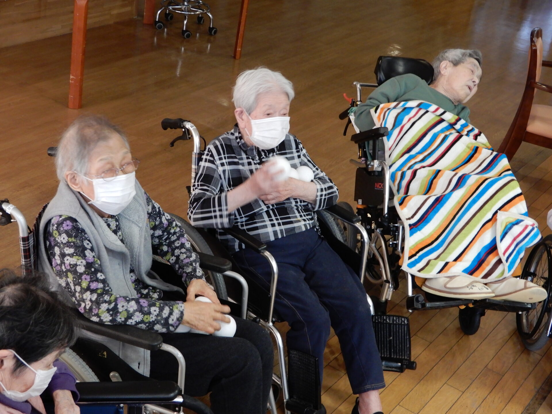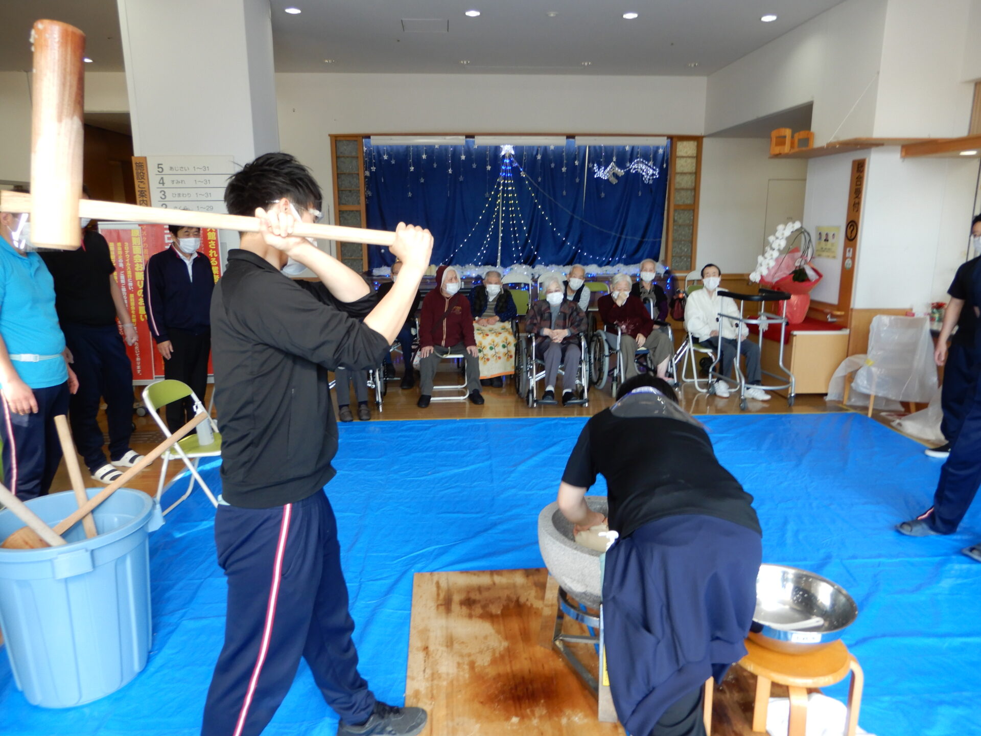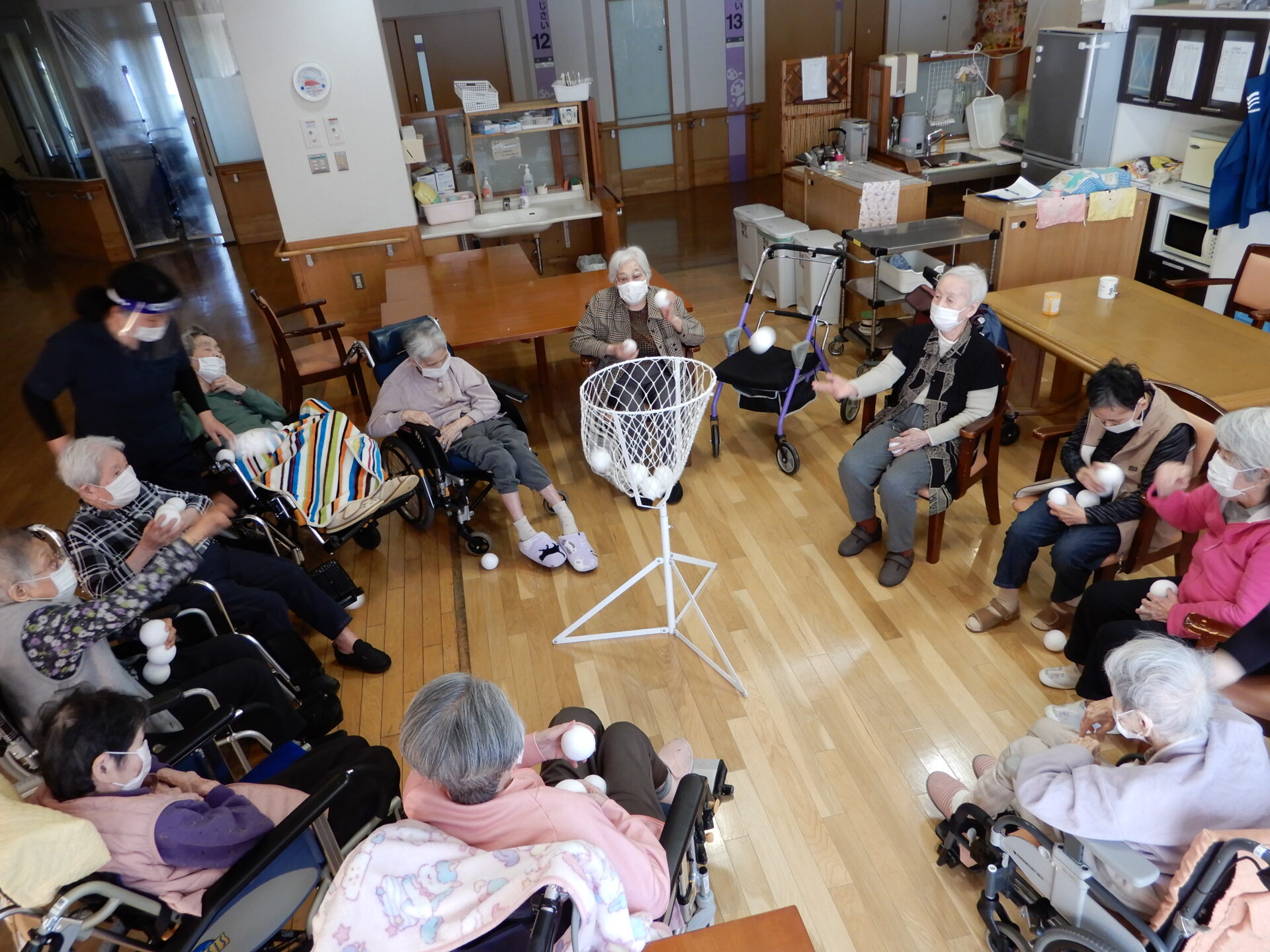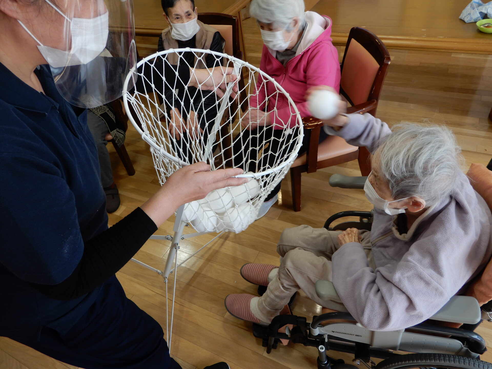 今月は、多くのレクリエーションがあり、生け花や魚釣り、玉入れや餅つきに、