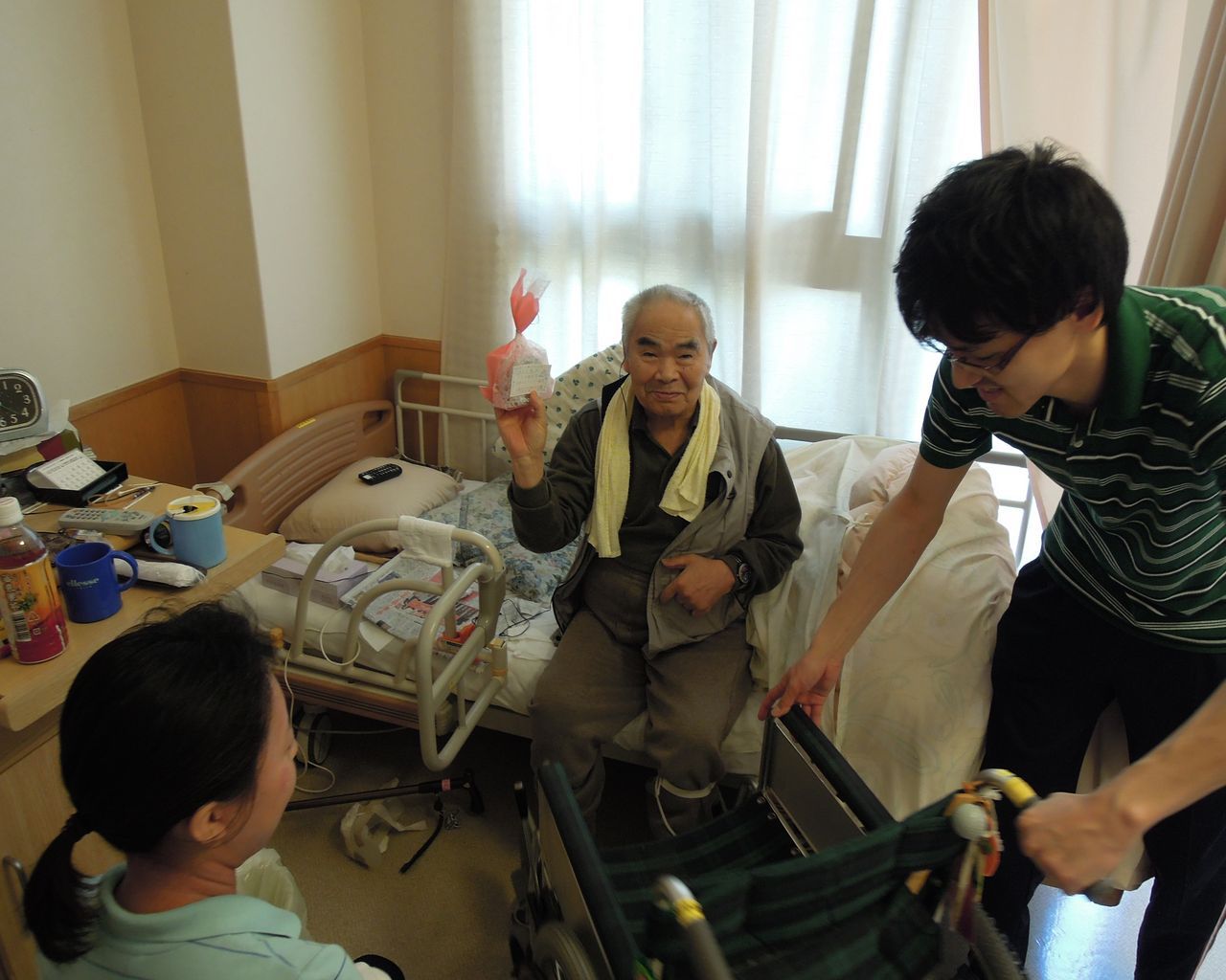 2012.05.16 喜寿のお祝い~☆ 先日、お誕生日を迎えたH氏。待ちに待ったプレゼントの時計が届いたので早速お届けすることに~なんとH氏、今年で喜寿なのです!めでたいですねー嬉しそうにされるのでこちらも嬉しいですするとお隣のU氏がお祝いに!H氏とU氏はいつも一緒に一階の喫茶室に行くほど仲良しさん賑やかな感じです!するとU氏が「もっと下から撮ってや~。足なごぉ見えるやろー」とのことw残念ながら足は写りませんでしたが普段と違うアングルで撮ってみましたHさん、これからも元気でいてくださいね 投稿者:大野